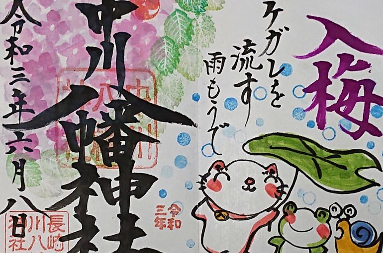 いつも頂いております中川八幡神社の可愛い御朱印も今月は紫陽花。御朱印の中の猫ちゃんやカエルに元気もらいます。
