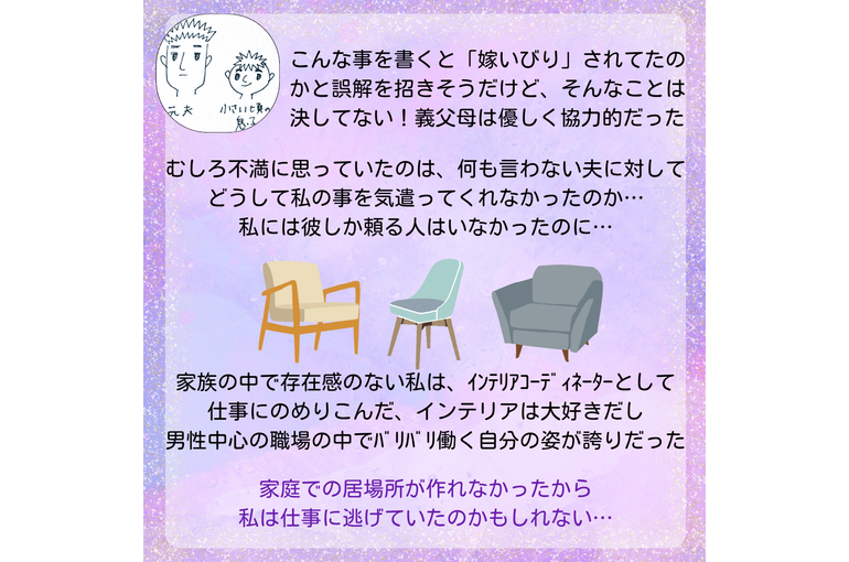 義実家での暮らしは円満でした…けど小さな寂しさ我慢を積み重ね、私が居場所作りを諦めたから、波風が立たなかったのかもしれません